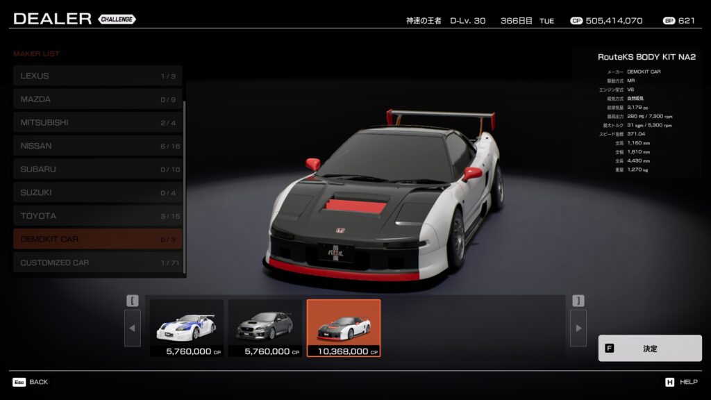 「DEMOKIT CAR」は、市販されているノーマルの車両に、実在する日本の著名なチューニングメーカーのパーツ(主にエアロキット)を装着した、特別なカテゴリです。ベース車両が持つ素性の良さを、各チューナーが独自の哲学でさらに磨き上げた、個性豊かなマシンが揃っています。ノーマルカーの延長線上にありながら、その走りは全くの別次元。日本の奥深いチューニング文化の一端に触れることができる、玄人好みのカテゴリと言えるでしょう。