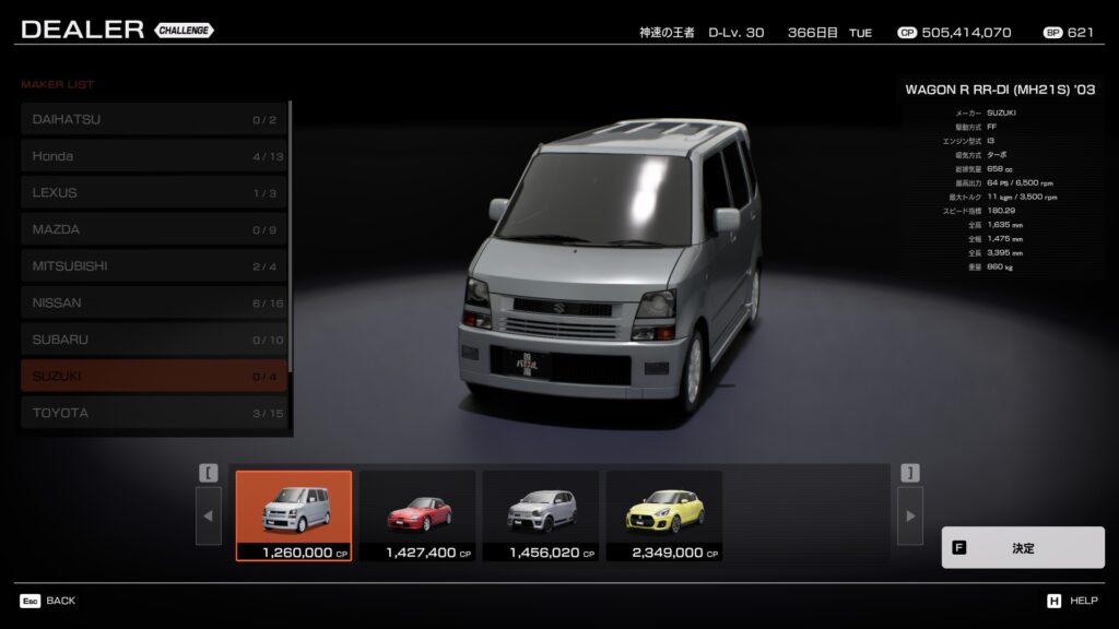特性: ダイハツ・ムーヴと並び、軽トールワゴン市場の覇権を争ったスズキの代表作。この「RR-DI」は、専用デザインのヘッドライトやエアロをまとった、最もスポーティなグレード。 心臓部には、軽自動車としては先進的な直噴(Direct Injection)ターボエンジンを搭載。低回転から力強いトルクを発生し、街乗りから首都高まで、キビキビとした走りを見せる。 ムーヴカスタム(L152S)とは永遠のライバル。4気筒のムーヴか、直噴のワゴンRか。そのキャラクターの違いが、プレイヤーの好みを二分するだろう。最大の弱点は、やはりトールワゴンゆえの高い重心高。