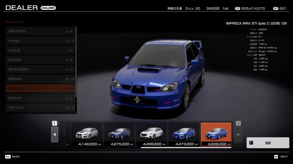 特性: ラリー競技で勝つためだけに、快適装備や遮音材を剥ぎ取って軽量化を施した、公道を走れる競技車両。ベースの鷹目GDB型自体が歴代屈指の戦闘力を持つが、「spec C」は別格。ボールベアリングターボの採用による鋭いレスポンス、専用チューンのエンジンと足回り、クイックなステアリングギア比など、全てが「速く走る」という一点に集約されている。 その走りは極めてシャープで、ドライバーの操作に対する反応速度はカミソリのよう。DCCDを駆使して、その鋭すぎる挙動を乗りこなすには高いスキルが求められるが、マスターした時のコーナリングスピードは、まさに異次元。
