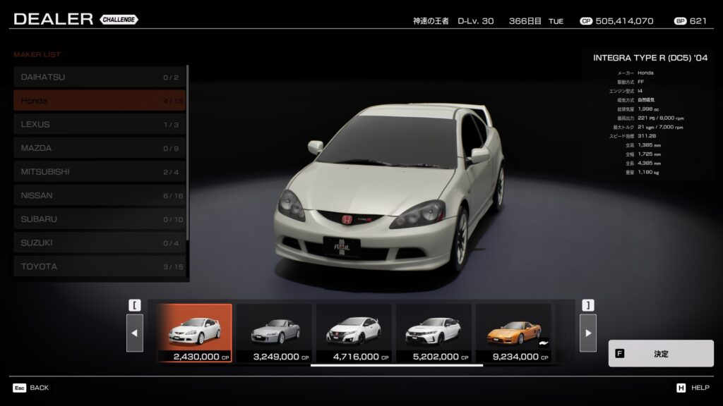 • ゲーム内での評価:『最速の座を継ぐ者』 テクニカルコースにおいて、DC2やEK9が「切れ味」で勝負するのに対し、DC5は「パワーと安定感」でねじ伏せる。C1のようなコースでも速いが、その真価は新環状のような中〜高速コーナーが続くステージで発揮される。トルクを活かしてコーナーから力強く立ち上がり、ライバルを引き離す様は、まさに王者の風格。FFクラスで本気で勝利を狙うプレイヤーにとって、最も合理的な選択肢となるだろう。