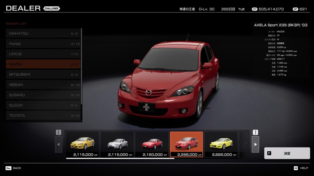 特性: アテンザで成功を収めたマツダが、その魅力をよりコンパクトなハッチバックに凝縮したモデル。フォードやボルボも使用した評価の高いプラットフォームをベースに、欧州車のような剛性感としなやかさを両立した足回りを持つ。 兄貴分のアテンザ(GG3S)より90kgも軽く、ホイールベースも短いため、ハンドリングはさらに軽快。C1のような切り返しが続くコースでは、その俊敏さを武器に格上を追い回すことも可能。エンジンはアテンザと同じ2.3Lで、パワーこそ控えめだが、実用域のトルクが厚く、扱いやすい。FF入門に最適な、隠れた名車。