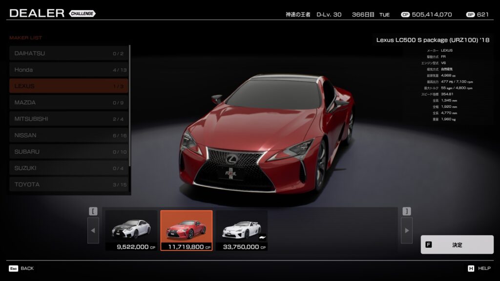 特性: RC Fと同じく、5.0LのNA V8エンジンを心臓部に持つ、レクサスの最上級グランドツアラー(GT)。RC Fよりもさらに車重は重く、2トンに迫るヘビー級。そのキャラクターは、サーキットよりも高速道路を優雅にクルージングすることに主眼が置かれている。 最新のGA-Lプラットフォームと、四輪操舵(LDH)などの電子デバイスにより、巨体を感じさせない安定したコーナリングを見せるが、物理的な重さはいかんともしがたい。湾岸線のような最高速ステージでは、その美しいボディとV8サウンドで見る者を魅了するが、C1に持ち込めば、重さとアンダーステアに苦しむことになるだろう。