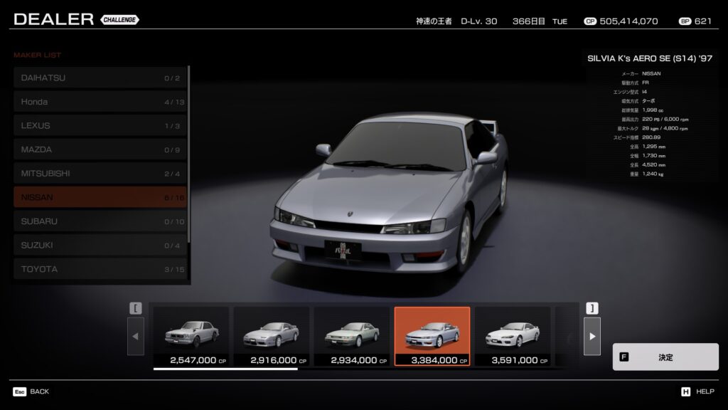 • ゲーム内での評価:『安定のドリフト・プラットフォーム』 S13よりも挙動がマイルドで安定しているため、FRやドリフトに慣れていないプレイヤーでも比較的扱いやすい。一方で、セッティングを突き詰めていけば、プロが求めるようなシビアなコントロールにも応えてくれる奥深さも持つ。初心者から上級者まで、幅広いプレイヤーにおすすめできる、FRスポーツの優等生。
