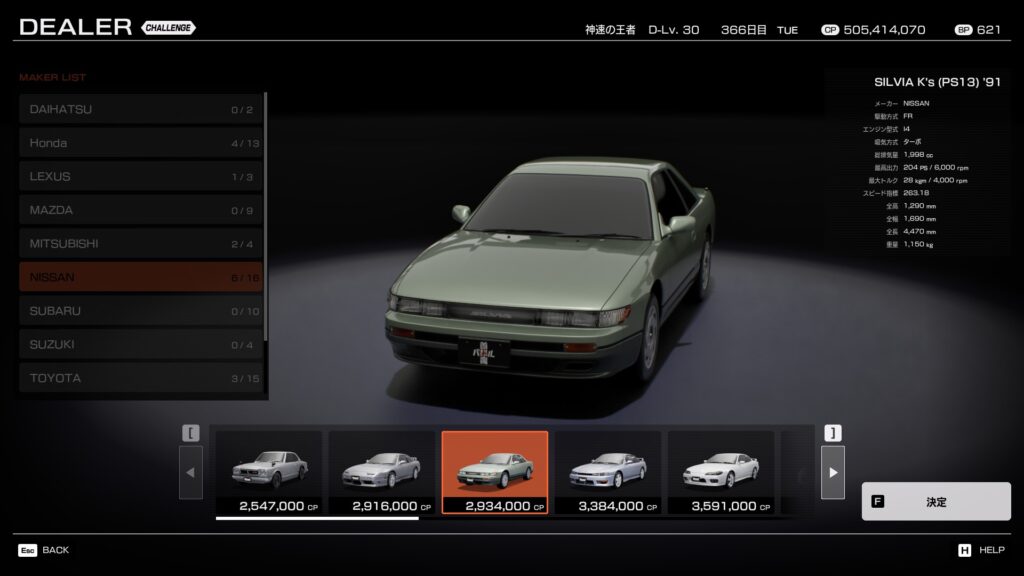 特性: 180SXと基本骨格を共有する兄弟車。リトラクタブルヘッドライトの180SXに対し、こちらは固定式のプロジェクターヘッドライトを持つ、流麗なクーペスタイルが特徴。「アートフォース・シルビア」のキャッチコピー通り、その美しいデザインで一世を風靡した。 中身は180SXとほぼ同じだが、車重はこちらの方が50kgも軽い。この軽さが最大の武器であり、ハンドリングはさらに軽快。特にコーナーの切り返しなどでは、180SXよりもシャープな動きを見せる。180SXと並び、ドリフトマシンとして最高の素質を持つ一台。