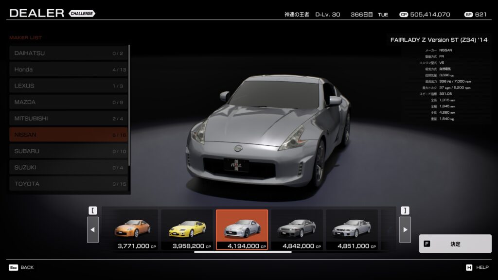 - ゲーム内での評価:『万能の肉体派』 Z33の正統進化版として、あらゆる面で性能が向上している。豊富なトルクとパワー、そして安定したシャシーにより、C1から湾岸線まで、どんなステージでも高いレベルで戦える万能選手。特にドリフトにおいては、そのコントロール性の高さからトップクラスの実力を持つ。パワフルなFRを求めるプレイヤーにとって、最高の選択肢の一つ。
