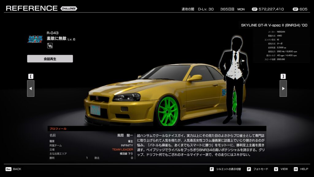 モットーは「勝利至上」。BNR34の高いポテンシャルを活かし、グリップからドリフトまで万能にこなすオールマイティー。首都高で死角はない。