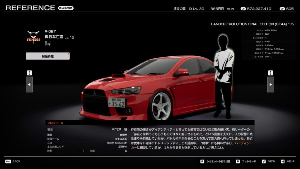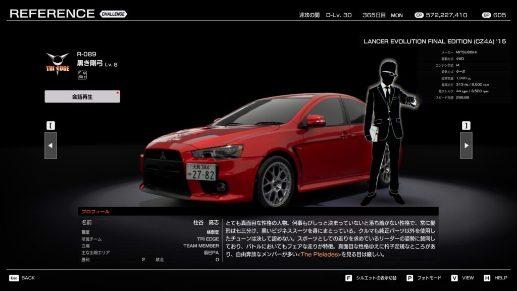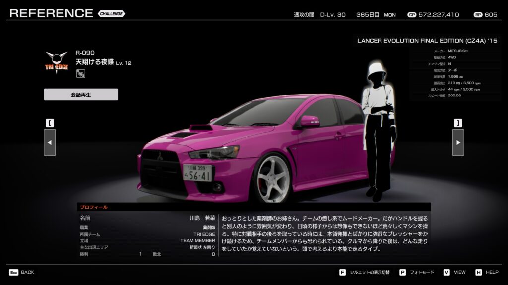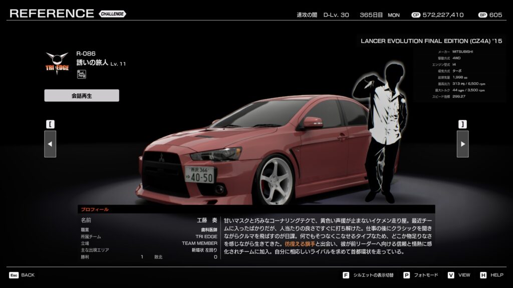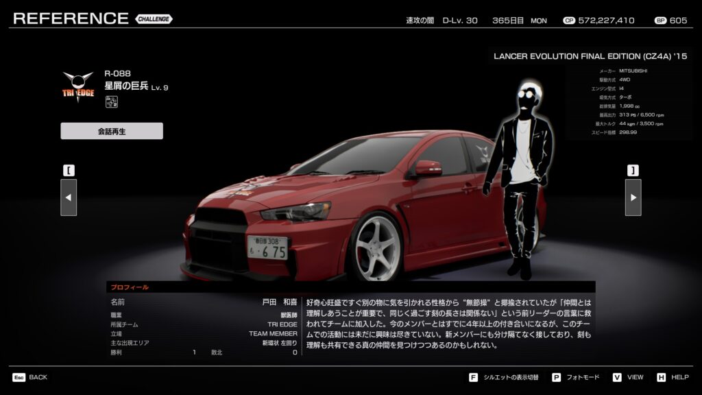 ・プロフィール:真面目で規律を重んじるタイプ。純正寄りの改造を好み、フェアな正攻法の走りを信条とする。バトルでも落ち着いて走り、チームの安定感を支える。