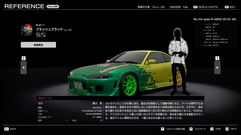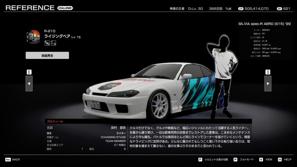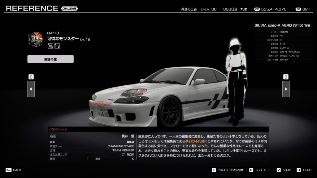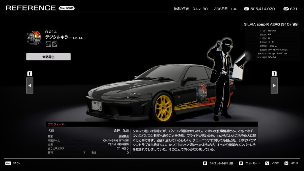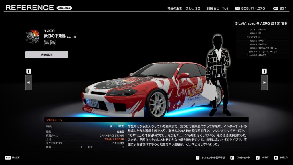 - プロフィール: 学生時代から編集部に出入りし、若くして編集長になったやり手。愛車の銀のシルビアに10年以上乗り続けており、走りもチューンも知り尽くしている。粘り強い性格は走りにも表れており、後半に引き離されると戦意を失う癖がある。