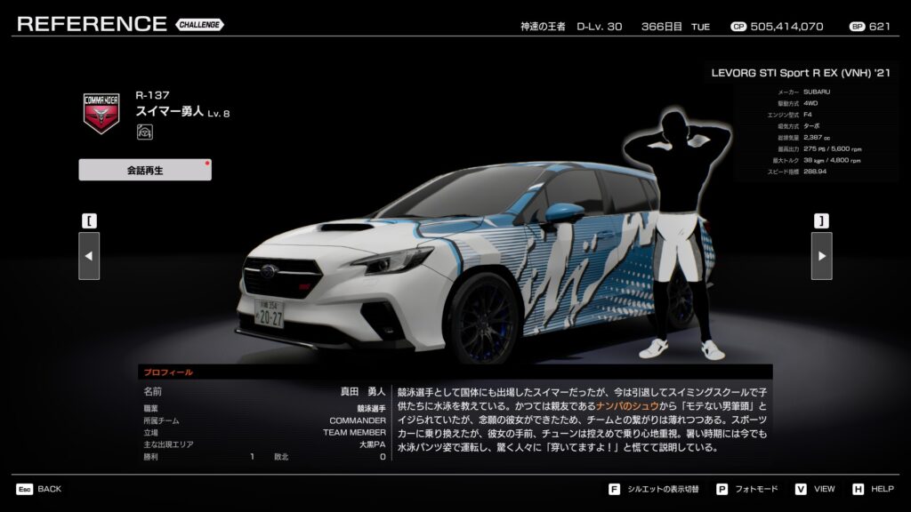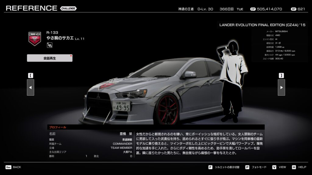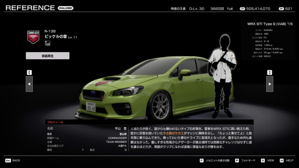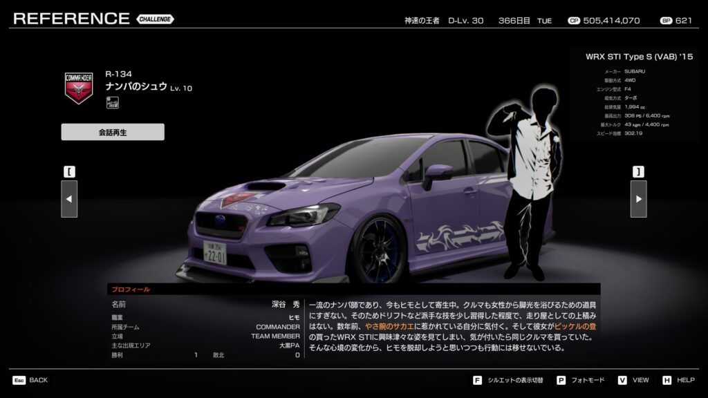 - プロフィール: 「善良なドライバーに鉄槌を下す」という歪んだ正義感を掲げるリーダー。愛車のWRX STIに高性能ブレーキを装着し、コーナー進入時の巧みなブレーキングと、サイド・バイ・サイドでのAWDの立ち上がりを活かした走法を得意とする。その腕前はまさに「制裁寸前」と呼ぶにふさわしい。
