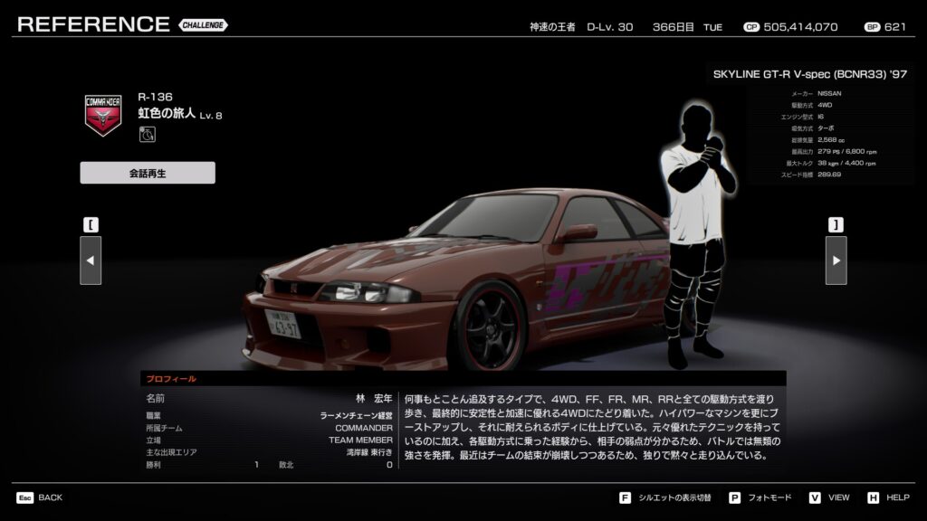- プロフィール: 4WD、FF、FR、MR、RRと全ての駆動方式を渡り歩いてきた経験豊富なドライバー。最終的に安定性と加速に優れた4WDにたどり着いた。ハイパワーなマシンを乗りこなし、各駆動方式で培った経験から、相手の弱点を的確に突く走りを見せる。
