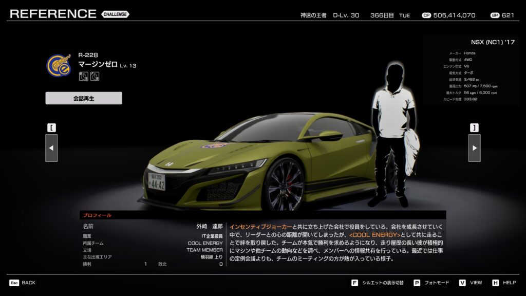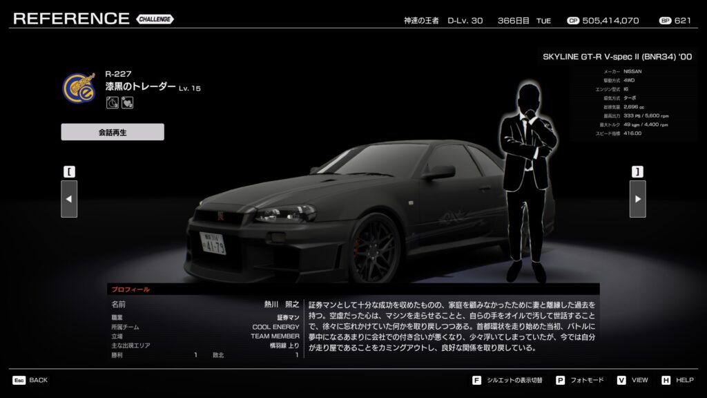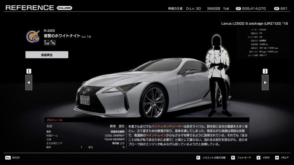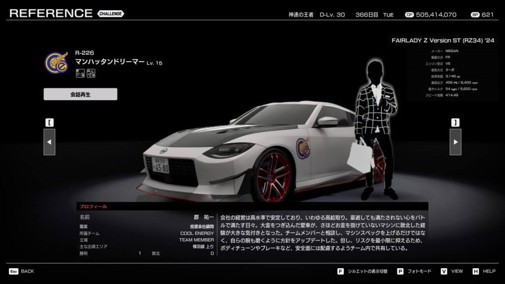 - プロフィール 会社の経営は高水準で安定しており、高給取り。満たされない心をバトルで満たす日々。大金をつぎ込んだ愛車が、もはやお金を儲け続けていないマシンに激怒した経験を持つ。自らの勝ちも厭わずように勝ちにいく方針をアップデートした。但し、リスクを最小限に抑えるため、安全面には配慮するようチーム内で共有している。