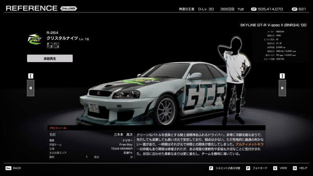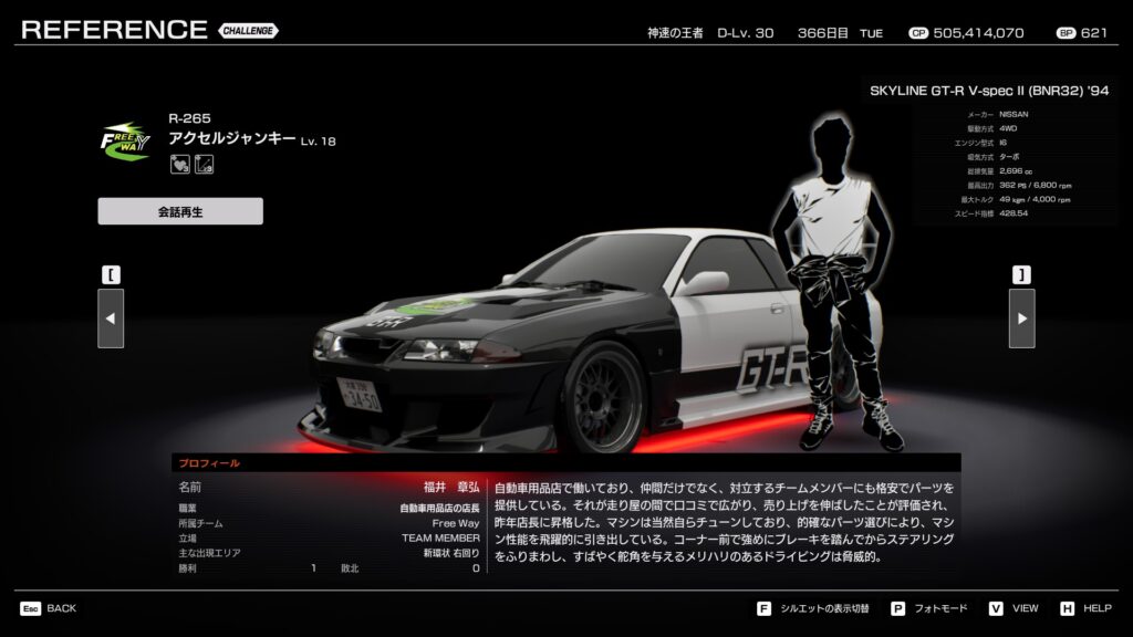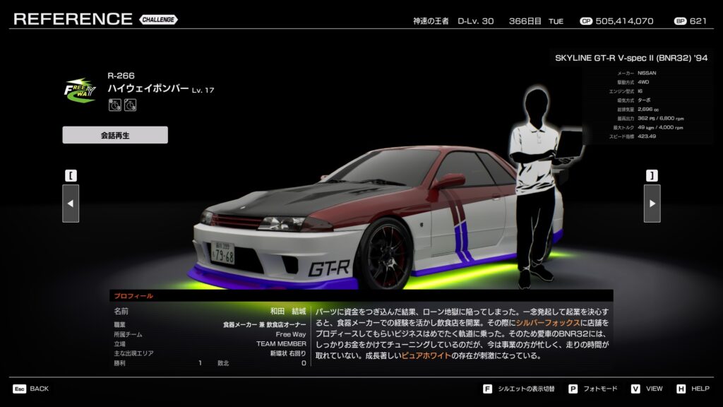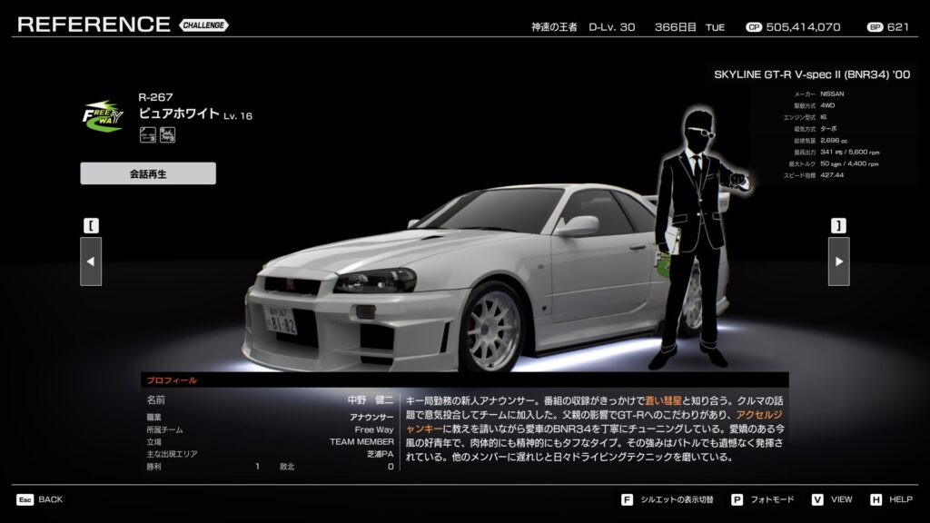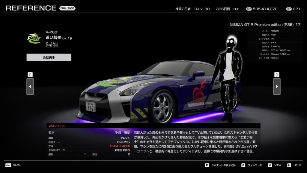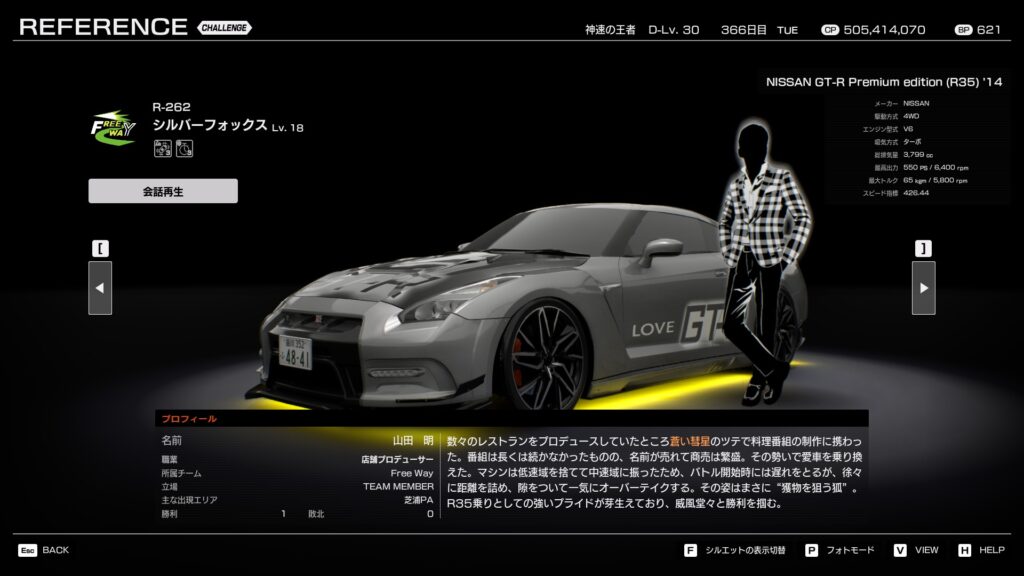 - プロフィール: 数々のレストランをプロデュースしてきた希代の才人。成功の証としてGT-Rに乗り換えた。バトル開始時には先行を避け、中速域から一気にオーバーテイクする「獲物を狙う狐」のスタイルを貫く。R35乗りとしてのプライドも芽生えている。