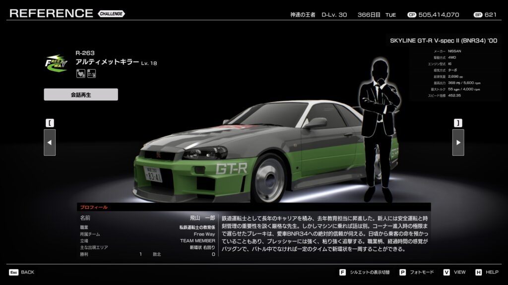 - プロフィール: 鉄道運転士として長年のキャリアを持つ、生真面目な男。新人には安全運転と時刻管理の重要性を説く厳格な先生。愛車BNR34への絶対的な信頼を抱える。プレッシャーに弱く、優柔不断な感覚に悩まされることもある。