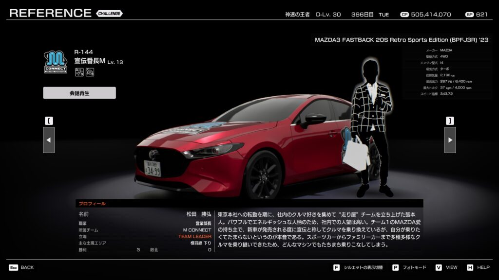- プロフィール: 社内のクルマ好きを集めてチームを立ち上げたエネルギッシュなリーダー。チームはマツダ車が中心。スポーツカーからファミリーカーまで様々な車種を乗り継いできた経験から、どんなマシンでもそつなく乗りこなす器用さを持つ。