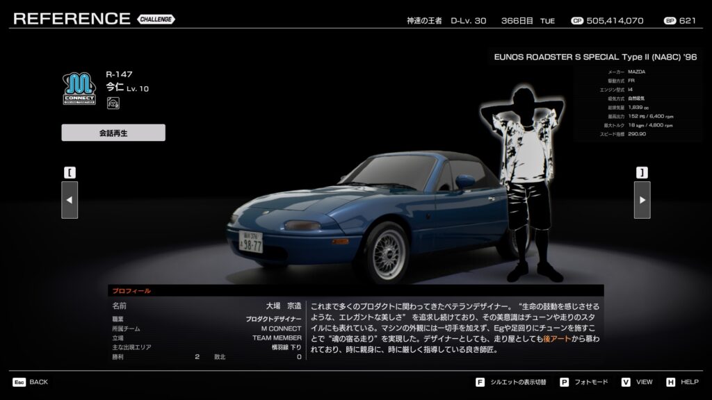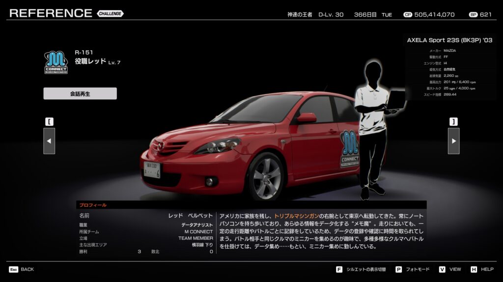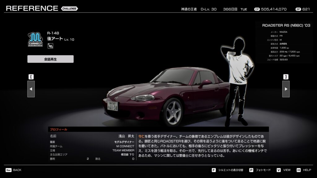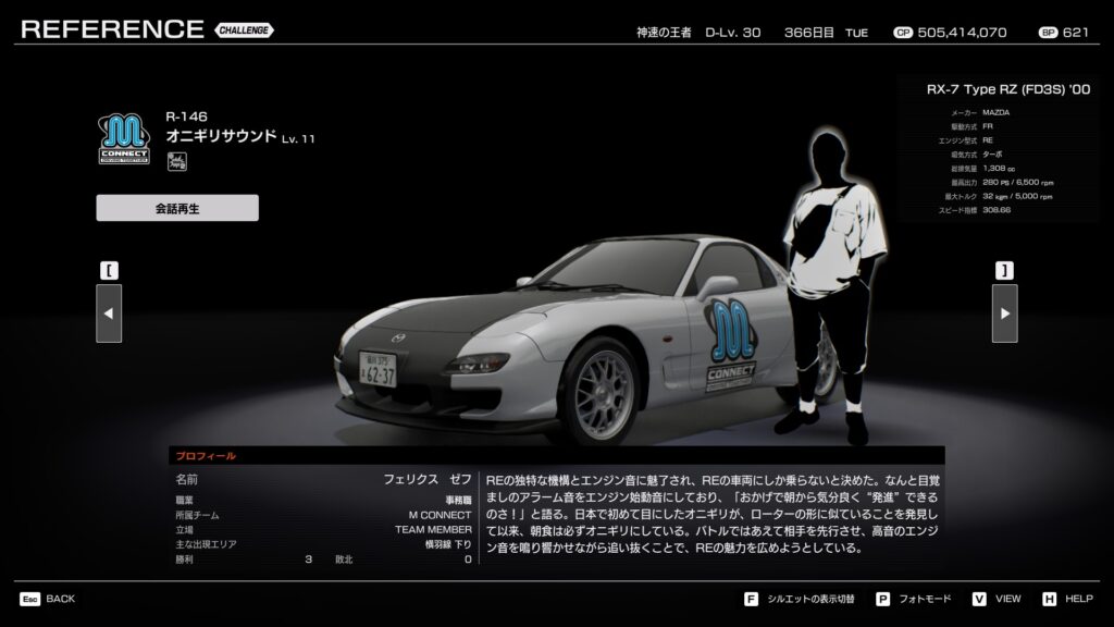 - プロフィール: ロータリーエンジンの独特な機構とエンジン音に魅了された男。バトルではあえて相手を先行させ、背後から高らかなロータリーサウンドを響かせながら追い抜くことで、REの魅力を広めようとしている。