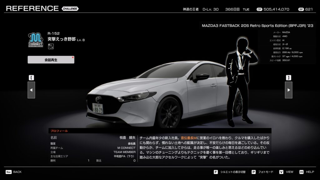 - プロフィール: リーダーの部署に配属された新人。クルマは購入したものの、慣れない走りへの反発心から、チーム加入後は猪突猛進な走りを見せる。チューニングよりもテクニックを磨くことを目標としており、その名の通り、ギリギリまで踏み込む大胆なアクセルワークが特徴。