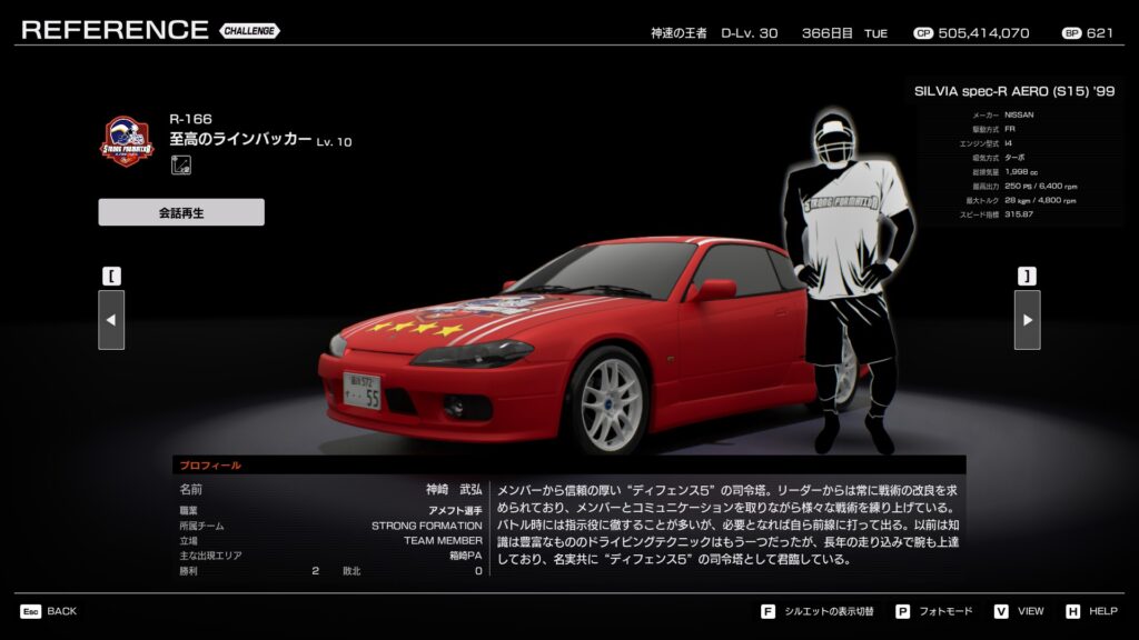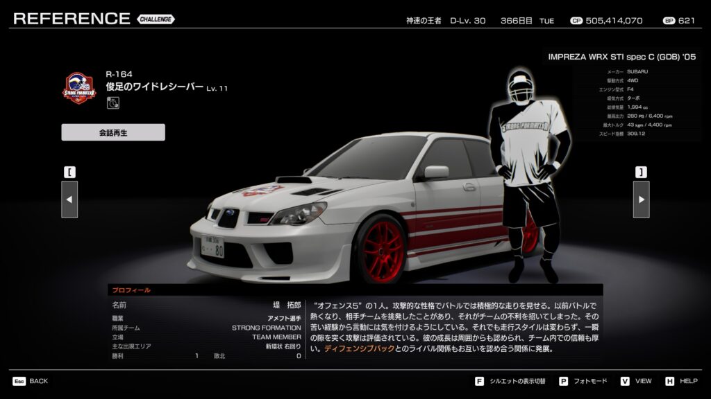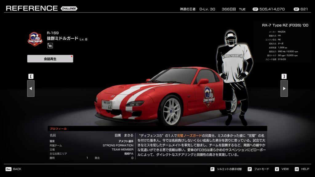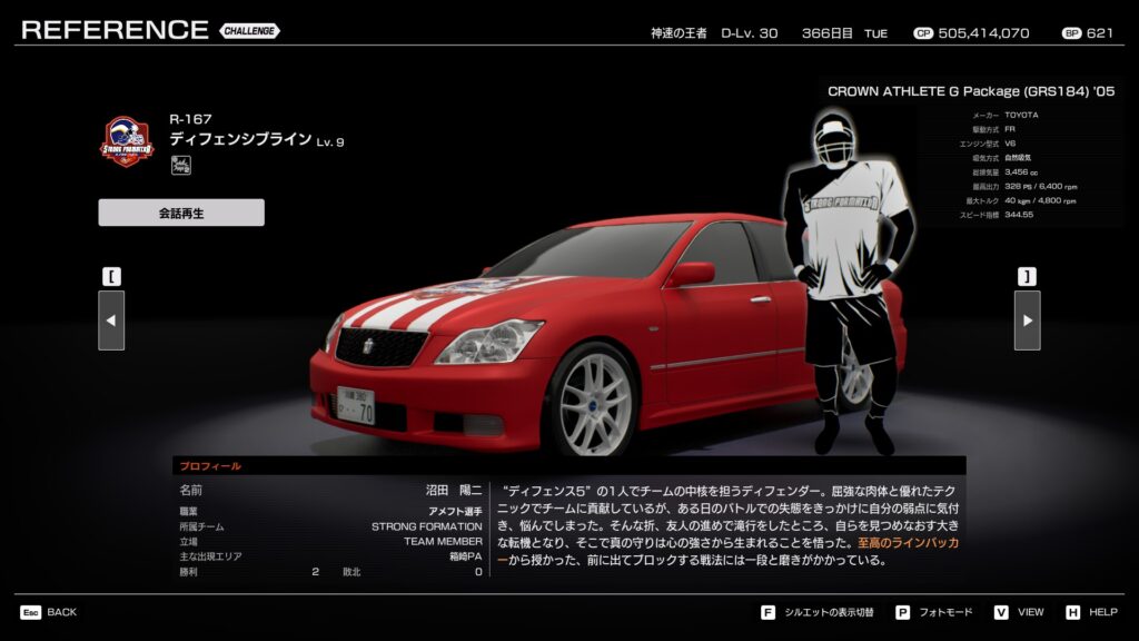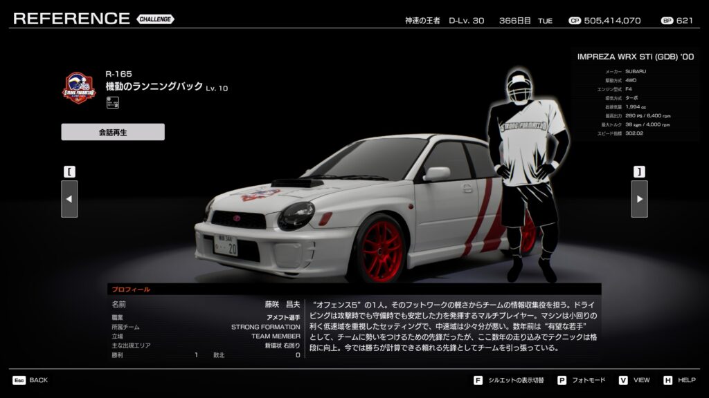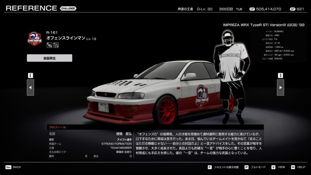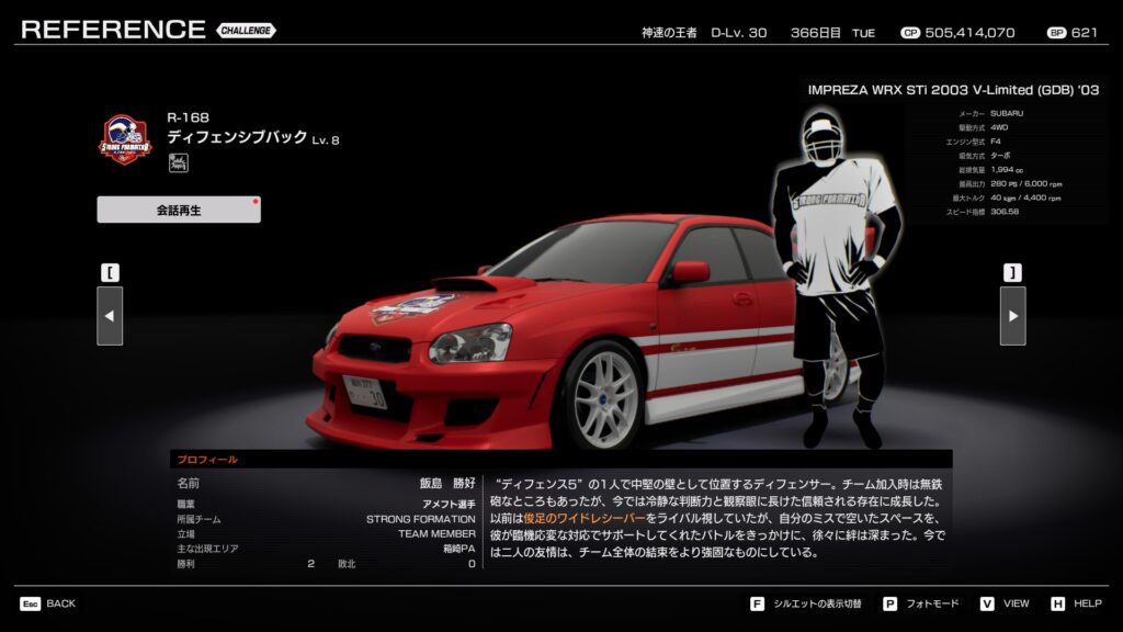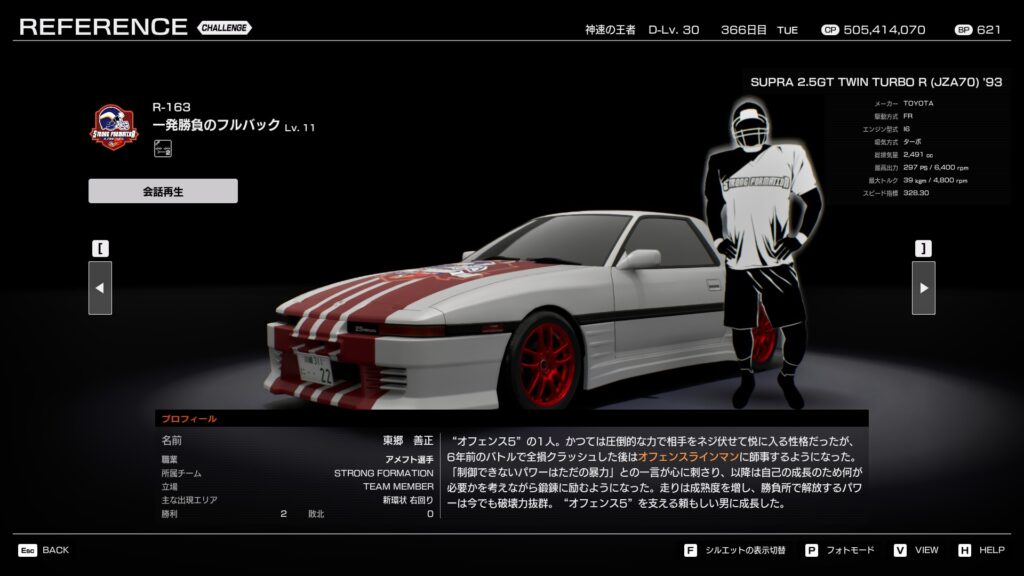 - プロフィール: 「ディフェンス5」の司令塔。リーダーから戦術の改良を求められ、メンバーとコミュニケーションを取りながら様々な戦術を練り上げている。長年の走り込みでドライビングテクニックも向上しており、名実共にディフェンスの要として君臨する。