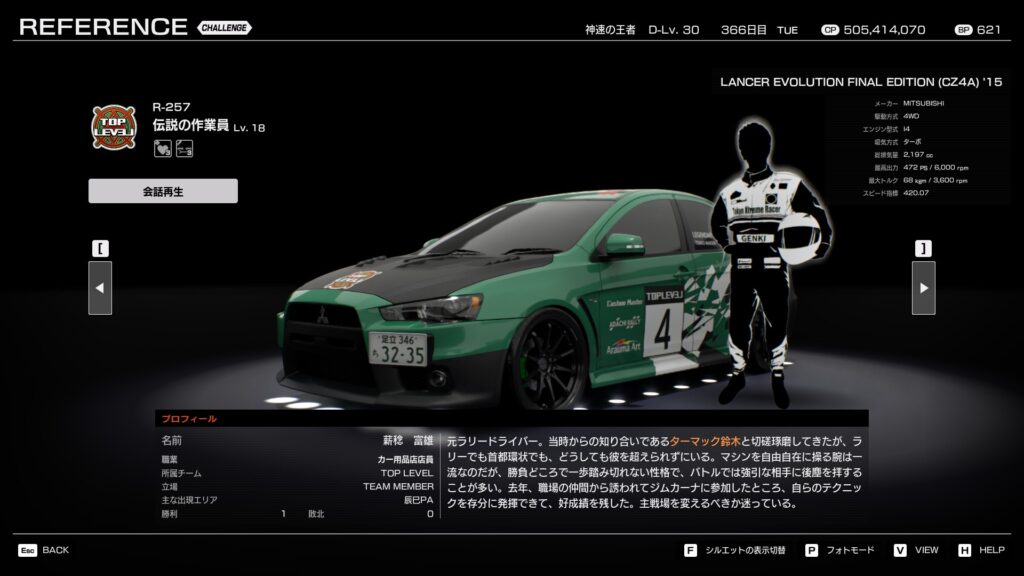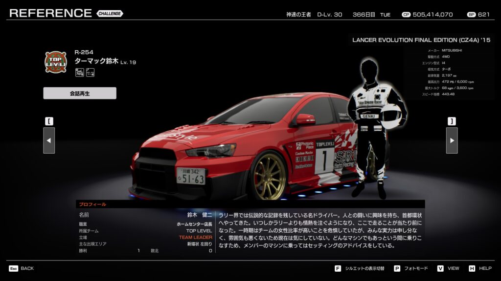 - プロフィール: 元ラリードライバー。「ターマック鈴木」とは当時からの知り合いであり、ライバルを超えた同志として理解し合っている。マシンを自在に操る腕は天才的だが、勝負どころで一歩踏み切れない性格。自身のテクニックを存分に発揮できておらず、好成績を残した。