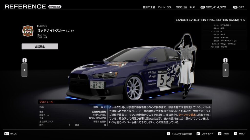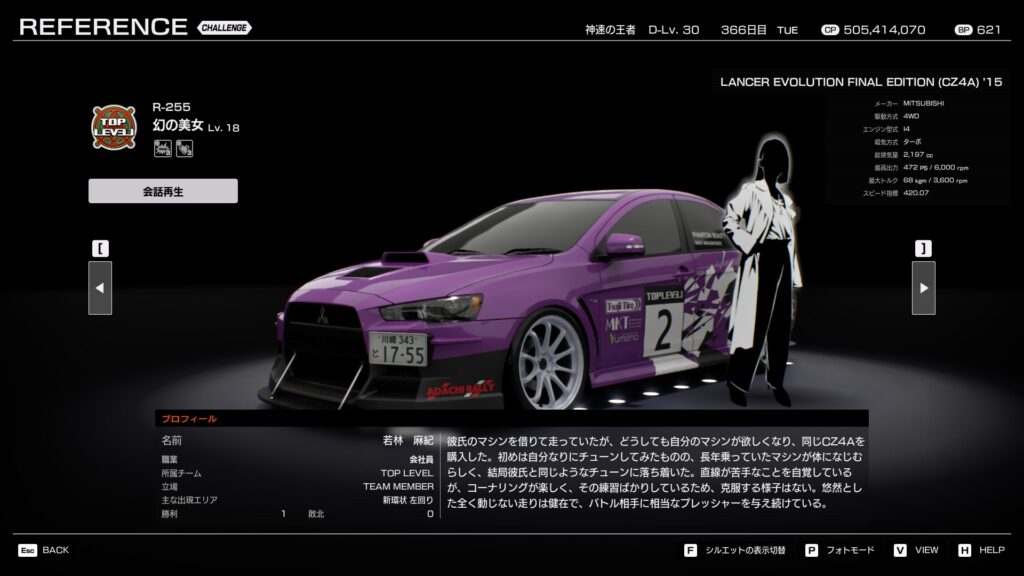 - プロフィール: ラリー界では伝説的な実績を誇る名ドライバー。人間への興味から首都高の世界へやってきた。かつてはチーム内の女性比率を意識していたが、今は実力さえあれば性別は問わない。メンバー全員のマシンにセッティングのアドバイスを行っている。