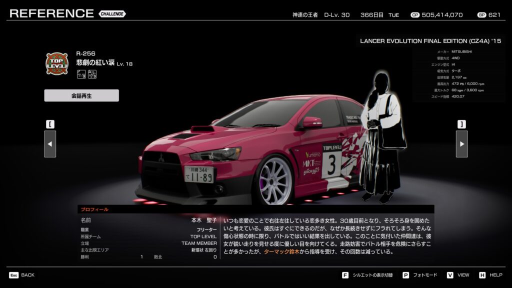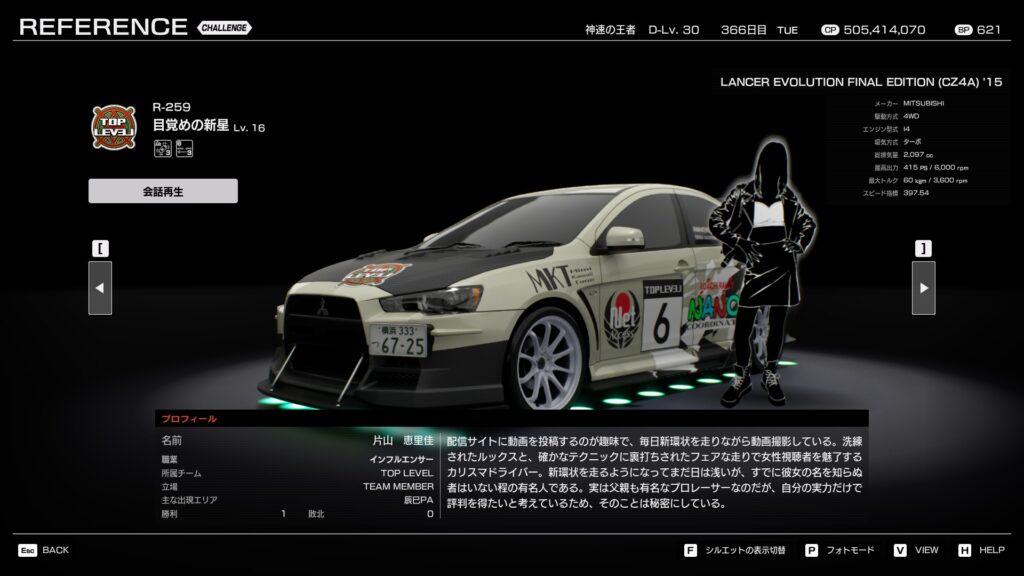 - プロフィール: 毎日動画投稿を走りながら動画配信している。洗練されたルックスと、確かなテクニックに裏打ちされたフェアな走りで女性視聴者を魅了するカリスマドライバー。実は父親も有名なプロレーサーなのだが、自分の実力だけで正当な評価を得たいと考えているため、そのことは秘密にしている。