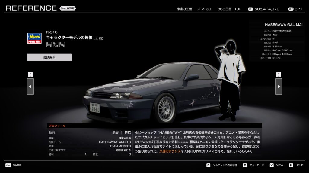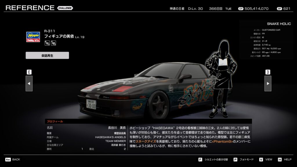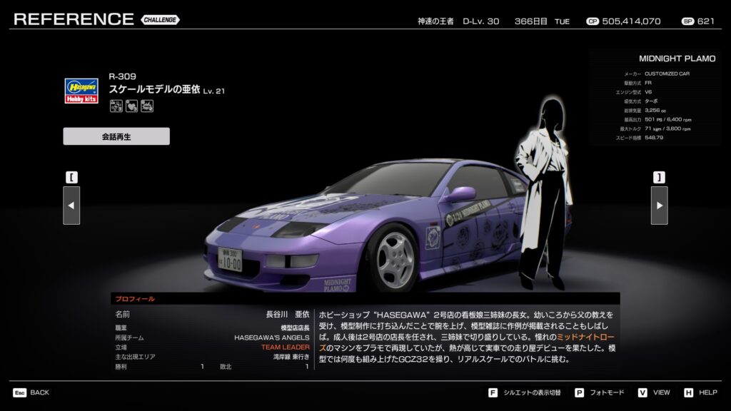 - 代表車種:MIDNIGHT PLAMO (カスタムZ32), HASEGAWA GAL MAI (カスタムR32), SNAKE HOLIC (カスタムスープラ70)