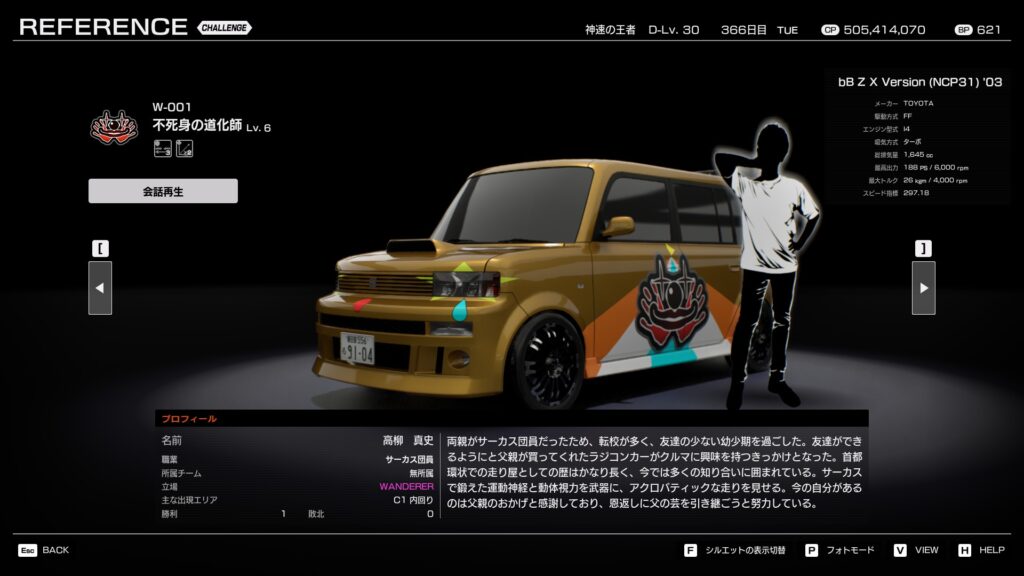 • 車種がbBのため絶対的なパワーはないが、その分、軽量な車体を活かした独特のコーナリングワークで相手を翻弄する。