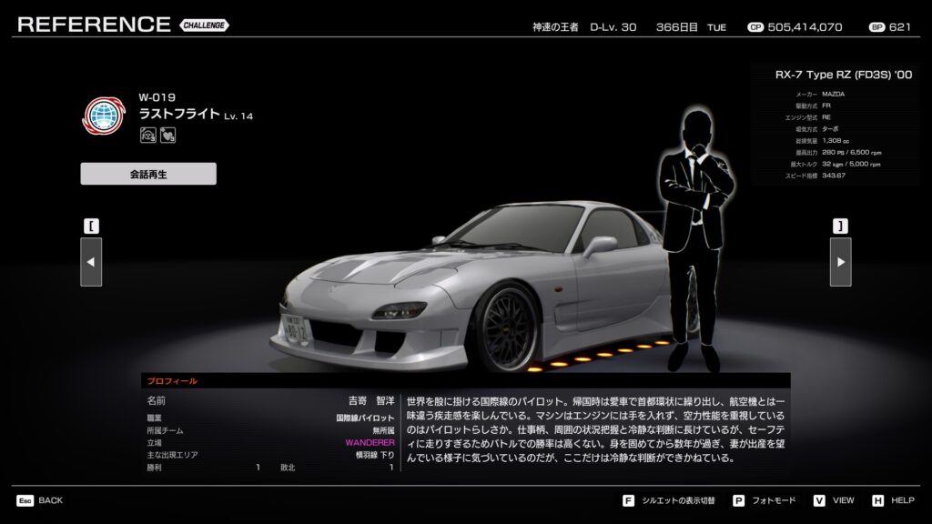 世界を股にかける国際線のパイロット。帰国時は愛車で首都高に繰り出し、航空機とは一味違う疾走感を楽しんでいる。マシンはエンジンには手を入れず、空力性能を重視しているのはパイロットらしさか。 仕事柄、周囲の状況把握と冷静な判断に長けているが、セーフティに走りすぎるためバトルでの勝率は高くない。身を固めてから数年が過ぎ、妻が出産を望んでいる様子に気づいているのだが、ここだけは冷静な判断ができかねている。
