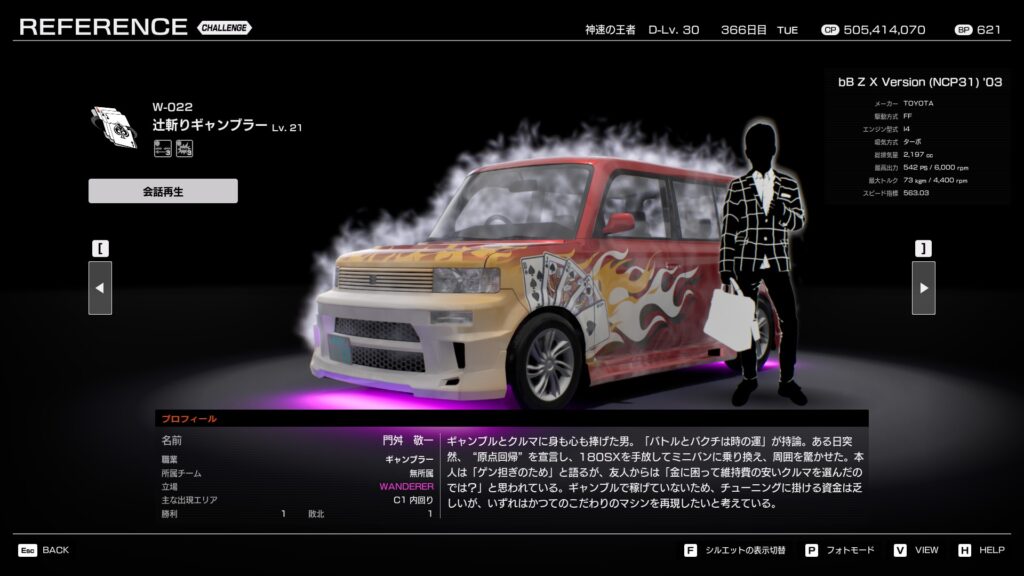 ギャンブルとクルマに身も心も捧げた男。「バトルとバクチは時の運」が持論。ある日突然、“原点回帰”を宣言し、180SXを手放してミニバンに乗り換え、周囲を驚かせた。 本人は「ゲン担ぎのため」と語るが、友人からは「金に困って維持費の安いクルマを選んだのでは?」と思われている。ギャンブルで稼げていないため、チューニングに掛ける資金は乏しいが、いずれはかつてのこだわりのマシンを再現したいと考えている。