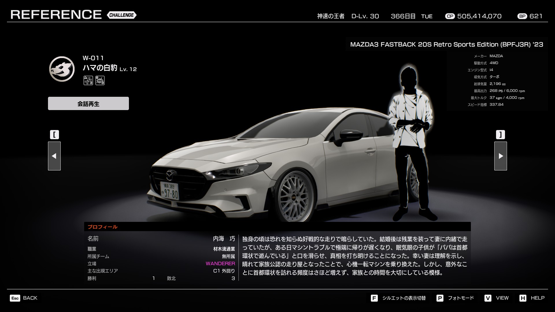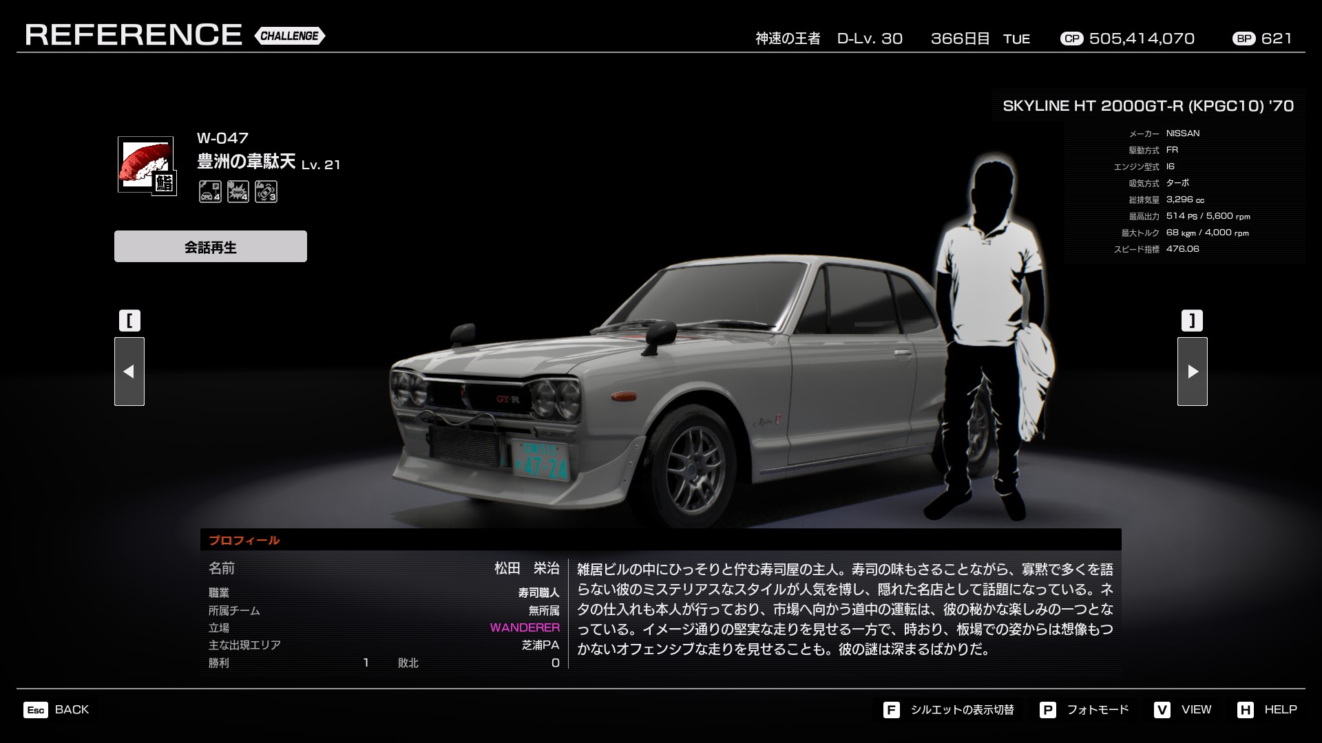日々、通勤やバトルでクルマに乗り続けているが、もう20年間も無事故無違反なのが自慢。自分の手足のように扱える愛車は、どんなコーナリングでも安定感抜群。最近では自ら手を加えたチューニングにより馬力やトルクをアップさせ、新たな楽しさに魅了されている。 仕事では外交員としての経験を活かし、政治の世界に進出する道を模索。クルマの安全運転や道路マナーについて積極的に啓発し、地域社会に貢献している。