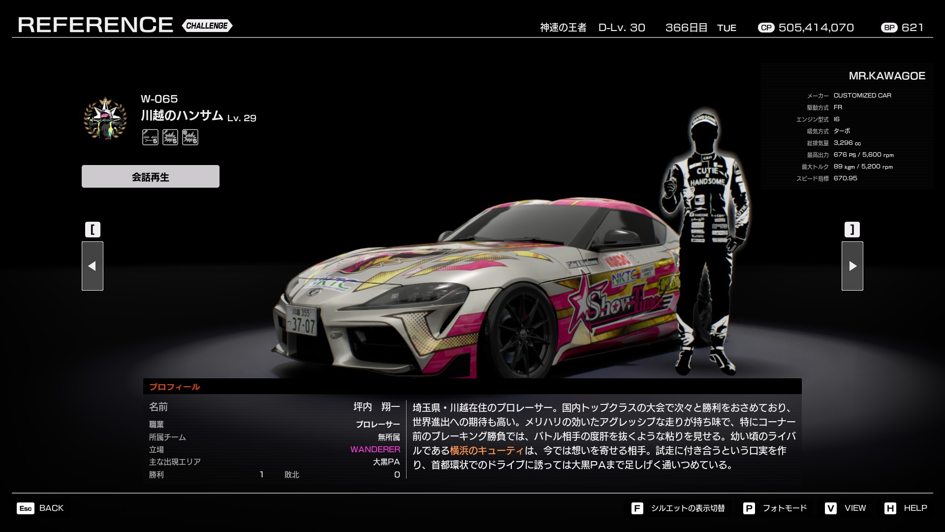 - 軽量なFFマシンであるコペンを巧みに操り、コーナリングを得意とする。