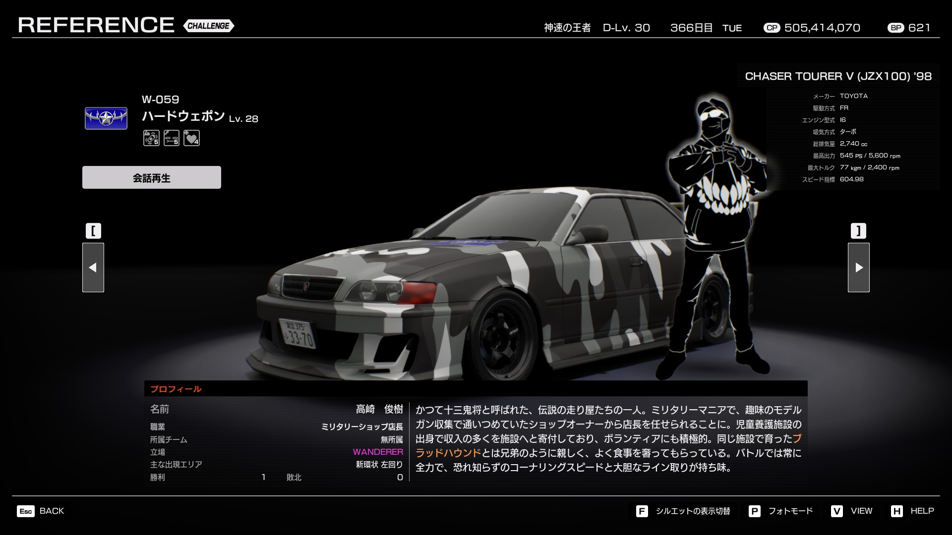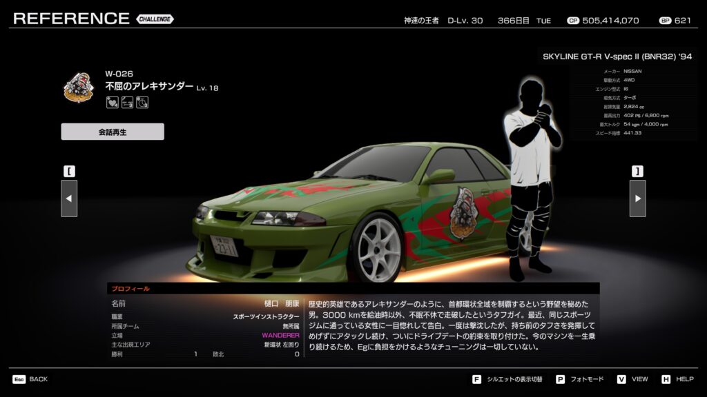 歴史的英雄であるアレキサンダーのように、首都高環状全域を制するという野望を秘めた男。3000kmを給油時以外、不眠不休で走破したという伝説を持つタフガイ。 最近、同じスポーツジムに通っている女性に一目惚れして告白。一度は撃沈したが、持ち前のタフさを発揮してめげずにアタックし続け、ついにドライブデートの約束を取り付けた。今のマシンを一生乗り続けるため、エンジンに負担をかけるようなチューニングは一切していない。