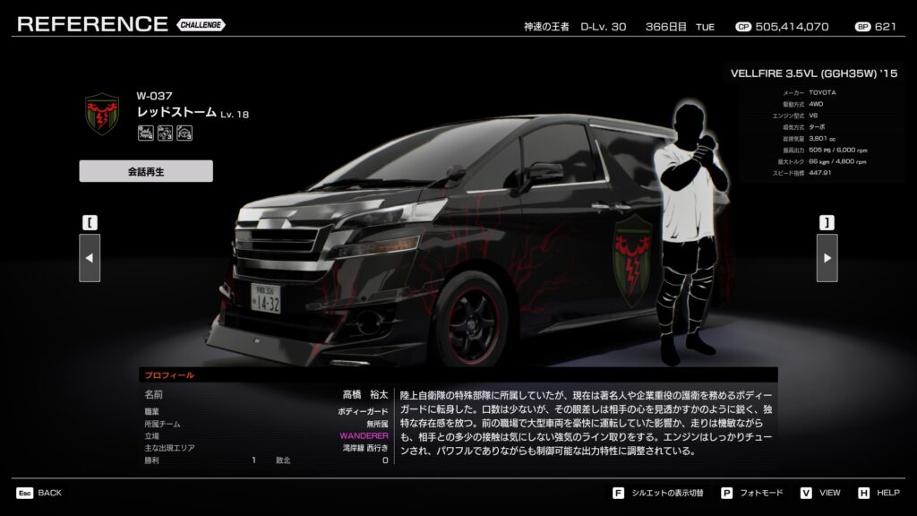 - 搭乗車種はミニバンのヴェルファイアだが、500馬力にまでチューニングされたモンスターマシン。