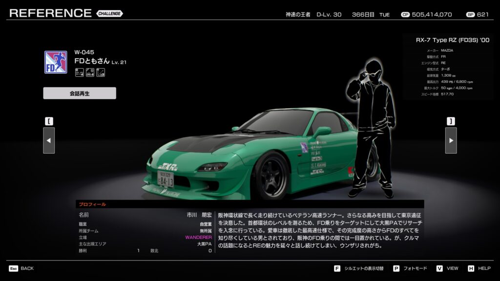 阪神環状線で長く走り続けているベテラン高速ランナー。さらなる高みを目指して東京遠征を決意した。首都高のレベルを測るため、FD乗りをターゲットにして大黒PAでリサーチを念入りに行っている。 愛車は徹底した最高速仕様で、その完成度の高さからFDのすべてを知り尽くしている男とされており、阪神のFD乗りの間では一目置かれている。が、クルマの話題になるとREの魅力を延々と話し続けてしまい、ウンザリされがち。