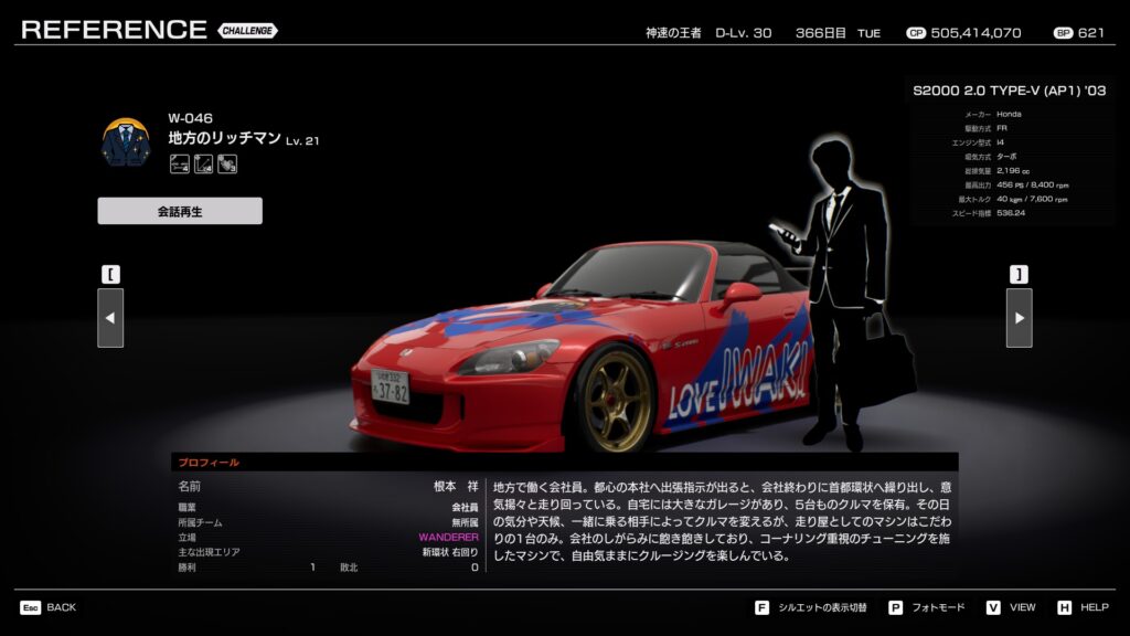 地方で働く会社員。都心の本社へ出張指示が出ると、会社終わりに首都高環状へ繰り出し、意気揚々と走り回っている。自宅には大きなガレージがあり、5台ものクルマを保有。その日の気分や天候、一緒に乗る相手によってクルマを変えるが、走り屋としてのマシンはこだわりの1台のみ。 会社のしがらみに飽き飽きしており、コーナリング重視のチューニングを施したマシンで、自由気ままにクルージングを楽しんでいる。