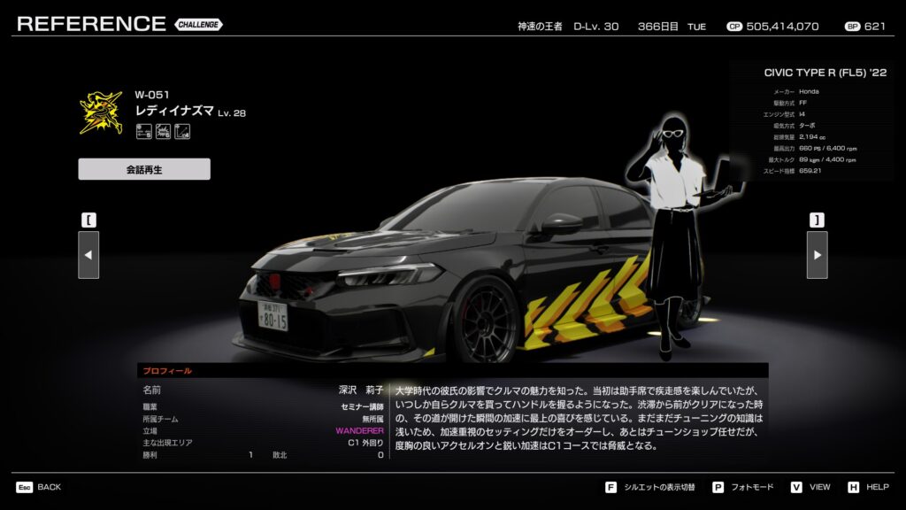 大学時代の彼氏の影響でクルマの魅力を知った。当初は助手席で疾走感を楽しんでいたが、いつしか自らクルマを買ってハンドルを握るようになった。渋滞から前がクリアになった時の、その道が開けた瞬間の加速に最上の喜びを感じている。 まだまだチューニングの知識は浅いため、加速重視のセッティングだけをオーダーし、あとはチューンショップ任せだが、度胸の良いアクセルオンと鋭い加速はC1コースでは脅威となる。