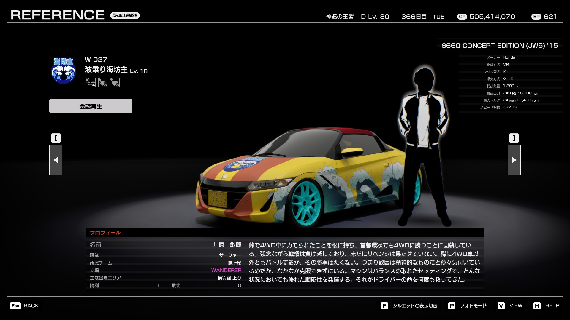 大学時代の彼氏の影響でクルマの魅力を知った。当初は助手席で疾走感を楽しんでいたが、いつしか自らクルマを買ってハンドルを握るようになった。渋滞から前がクリアになった時の、その道が開けた瞬間の加速に最上の喜びを感じている。 まだまだチューニングの知識は浅いため、加速重視のセッティングだけをオーダーし、あとはチューンショップ任せだが、度胸の良いアクセルオンと鋭い加速はC1コースでは脅威となる。