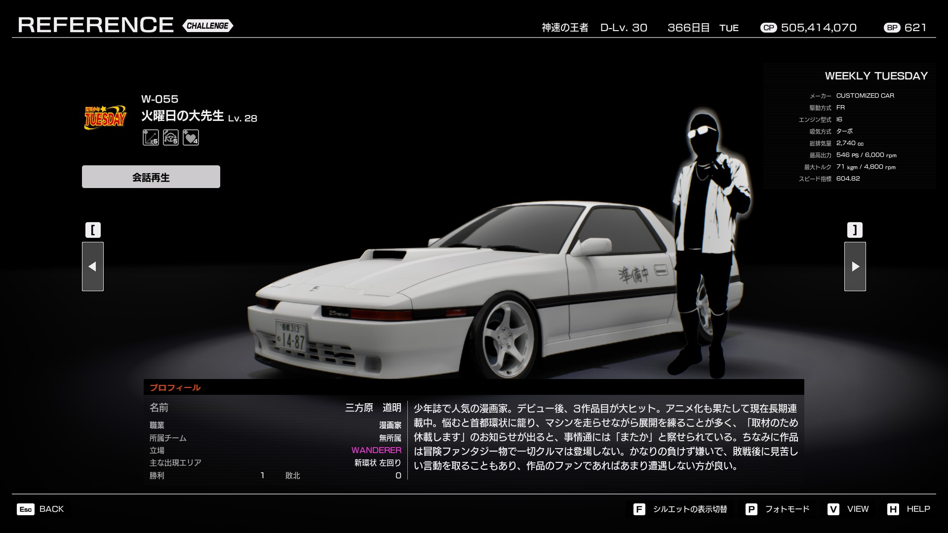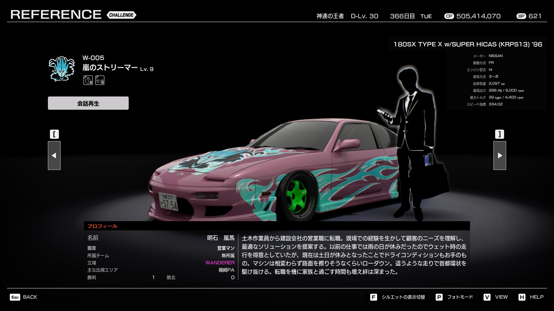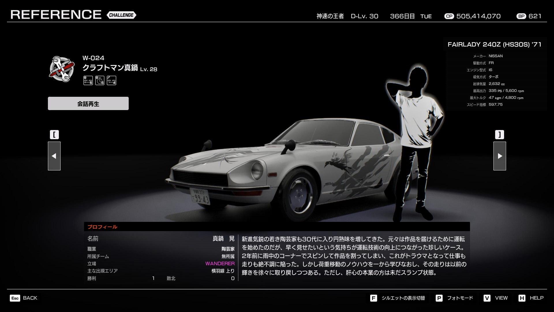 - 伝説的な腕前を持つプロフェッショナルであり、その走りは非常に精密で無駄がない。
