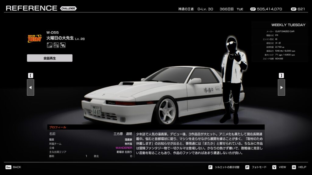 少年誌で人気の漫画家。デビュー後、3作品目が大ヒット。アニメ化も果たして現在長期連載中。悩むと首都高環状に籠り、マシンを走らせながら展開を練ることが多く、「取材のため休載します」のお知らせが出ると、事情通には「またか」と察せられている。 ちなみに作品は冒険ファンタジー物で一切クルマは登場しない。かなりの負けず嫌いで、敗戦後に見苦しい言動を取ることもあり、作品のファンであればあまり遭遇しない方が良い。