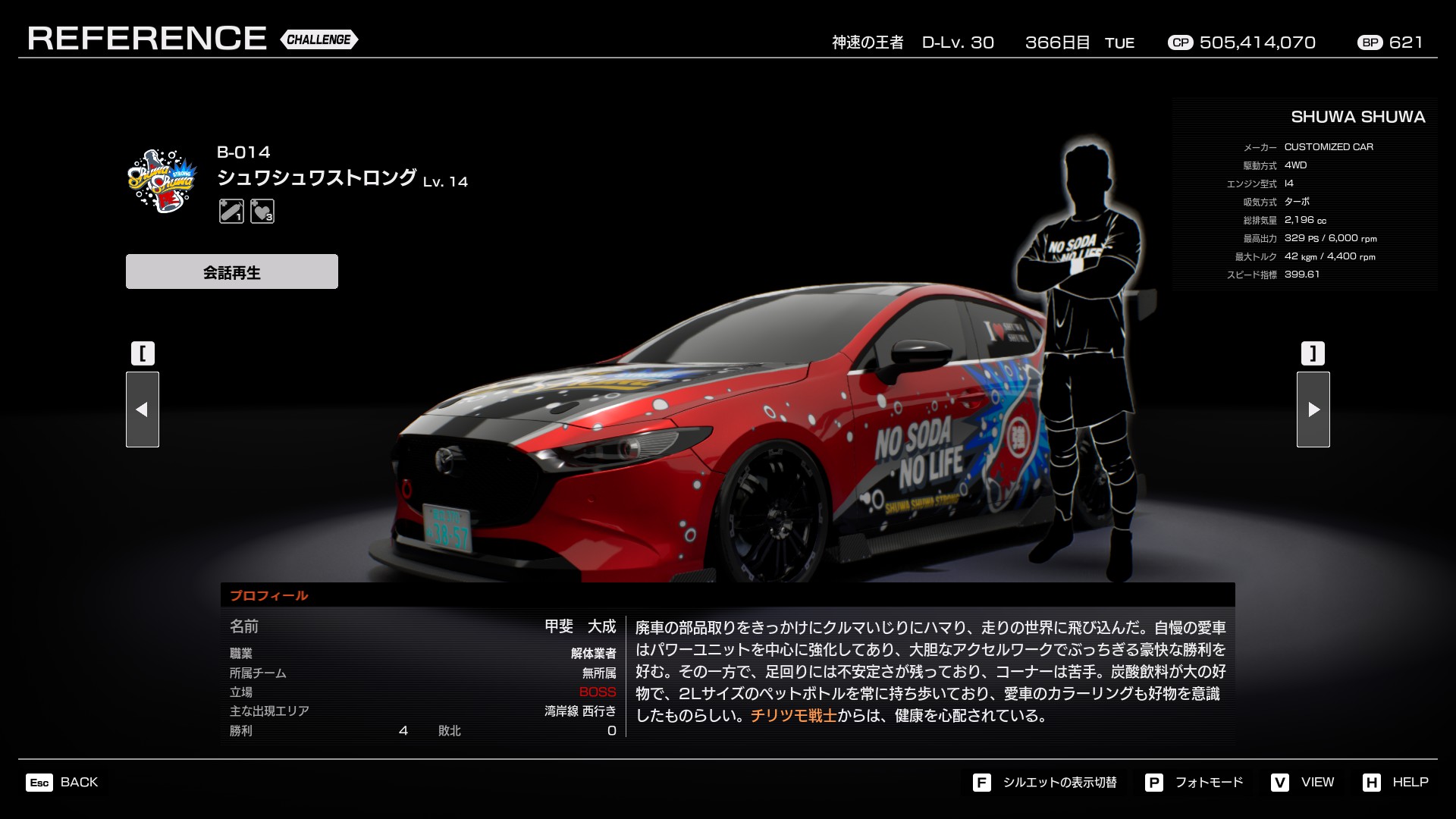 - 搭乗車種はバランスの取れた4WDカスタムカー。安定した走りが持ち味。