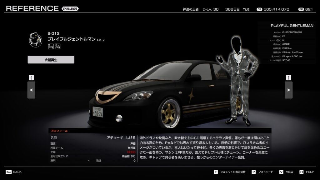 - 搭乗車種:PLAYFUL GENTLEMAN (カスタムカー)