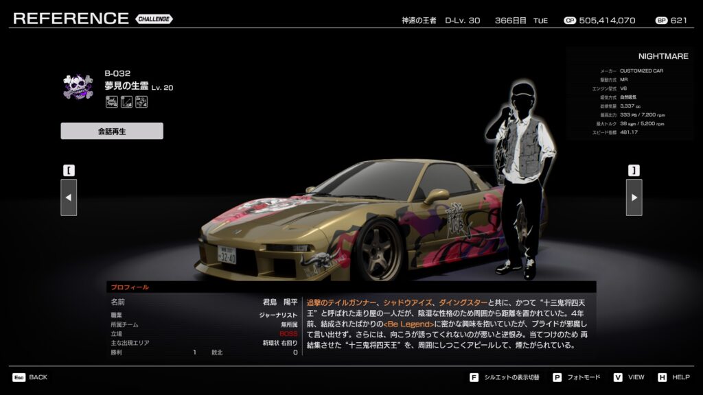 - 搭乗車種:NIGHTMARE (NSXベース? カスタムカー)