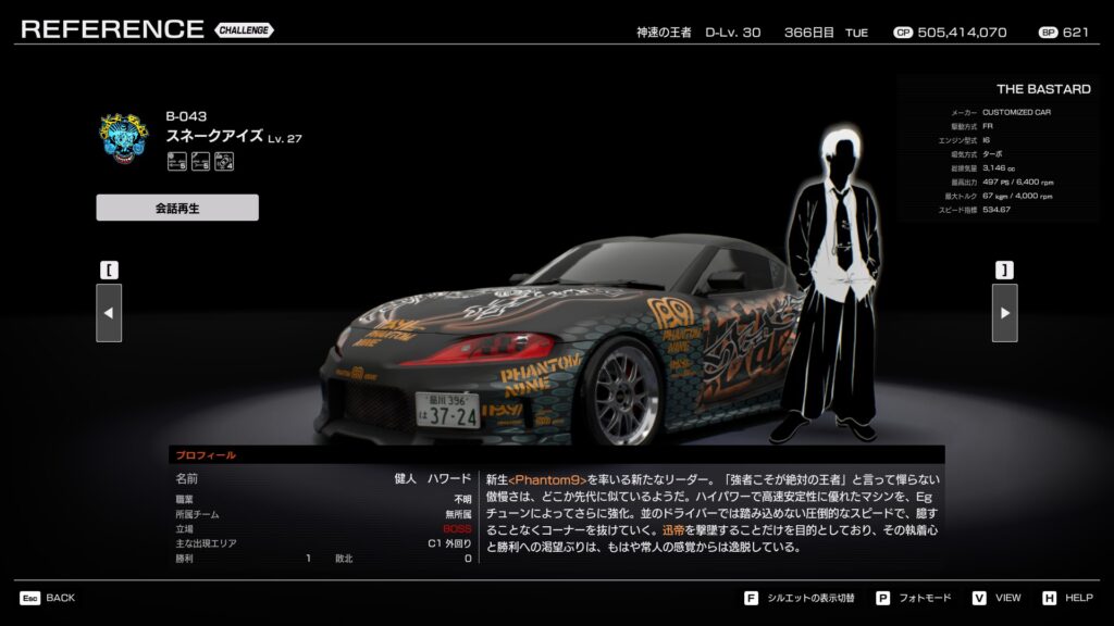 新生<Phantom9>を率いる新たなリーダー。「強者こそが絶対の王者」と言って憚らない傲慢さは、どこか先代に似ているようだ。ハイパワーで高速安定性に優れたマシンを、エンジンチューンによってさらに強化。 並のドライバーでは踏み込めない圧倒的なスピードで、臆することなくコーナーを抜けていく。「迅帝」を撃墜することだけを目的としており、その執着心と勝利への渇望ぶりは、もはや常人の感覚からは逸脱している。