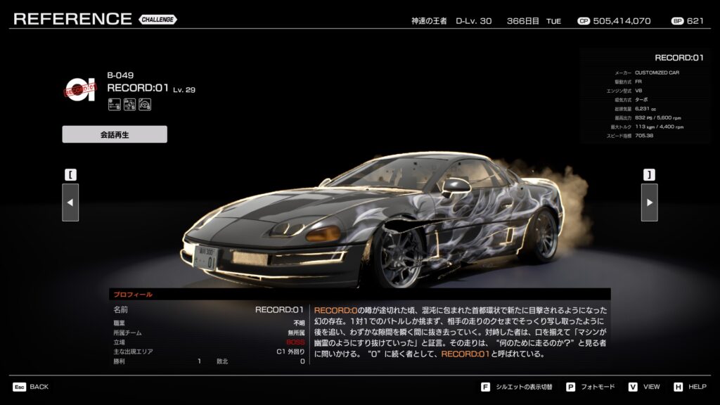 「RECORD:0」の噂が途切れた頃、混沌に包まれた首都高環状で新たに目撃されるようになった幻の存在。1対1でのバトルしか挑まず、相手の走りのクセまでそっくり写し取ったように後を追い、わずかな隙間を瞬く間に抜き去っていく。 対峙した者は、口を揃えて「マシンが幽霊のようにすり抜けていった」と証言。その走りは、“何のために走るのか?”と見る者に問いかける。“0”に続く者として、「RECORD:01」と呼ばれている。