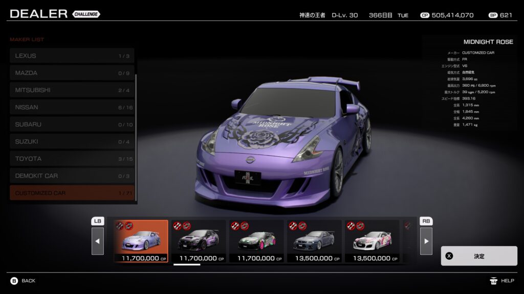 ディーラー画面の表示情報をもとに、カスタムカー「MIDNIGHT ROSE」を指定構成で解説します。