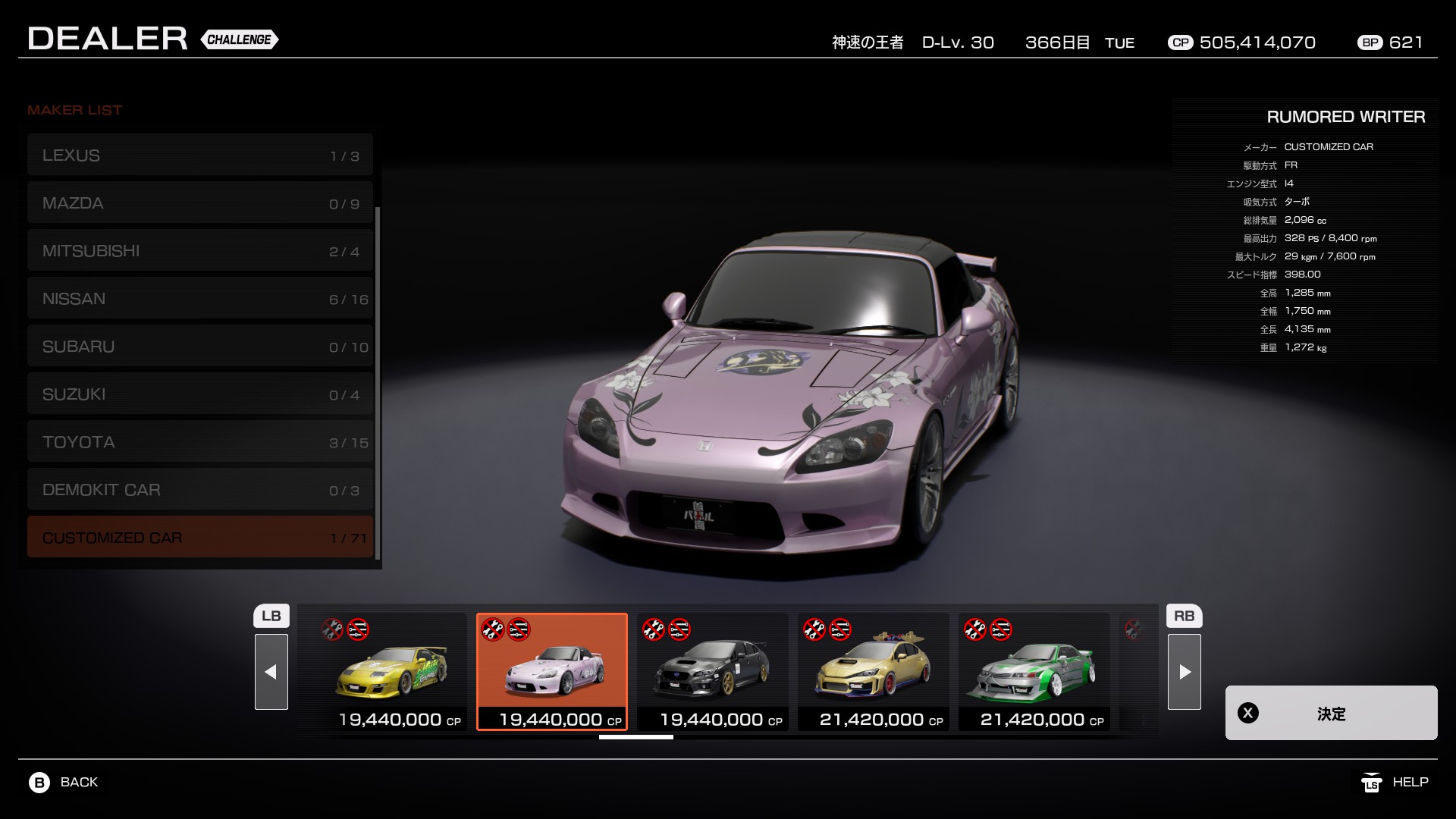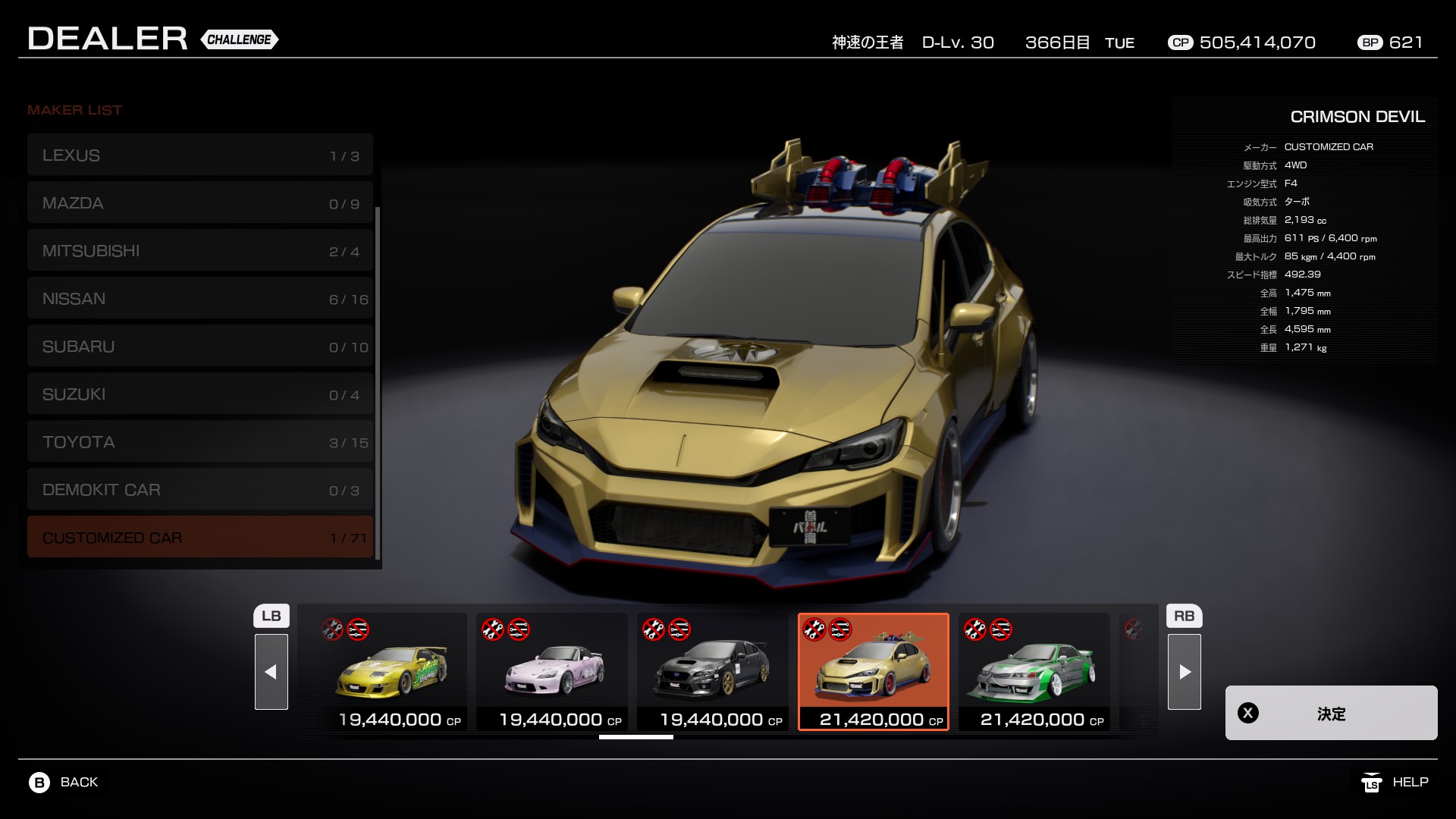 性格は「グリップで路面を掴んで、太いトルクで押し切る実戦派」。4WDらしい安心感と、フロント周りの迫力あるエアロが“速さ優先”を主張します。フードスクープが目立つため、見た目の時点でターボ車の雰囲気が濃く、街中でも首都高でも“刺さる”存在感。インプレッサ系のイメージそのままに、コーナー出口での加速が主役になりそうな一台です。