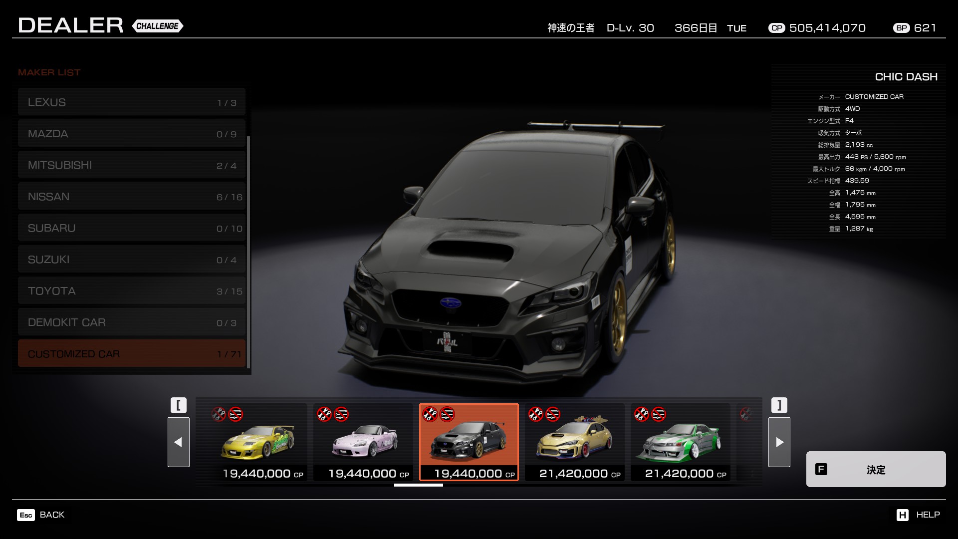 「CHIC DASH」は、無駄を削ぎ落としたブラックボディに、フードスクープとルーフキャリア、ゴールド系ホイールを合わせた“シックだけど速い”系のカスタムカーです。見た目は落ち着いているのに、中身は高トルク4WDターボで踏んだ瞬間に前へ出るタイプ。ベース車はスバルのWRXがベース車と思われます。