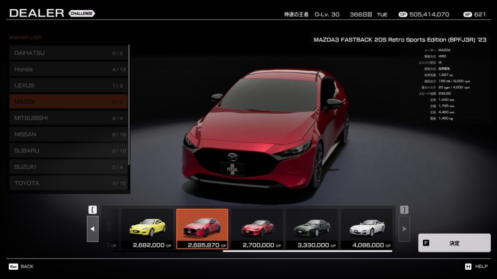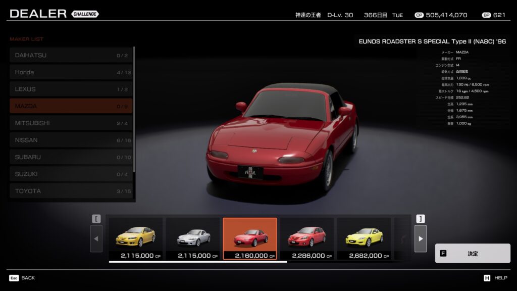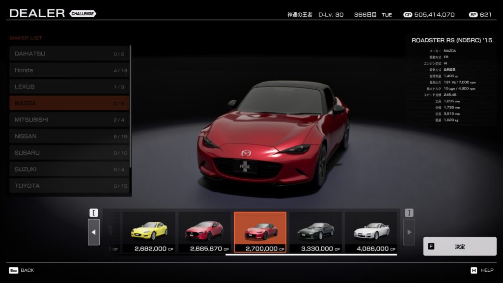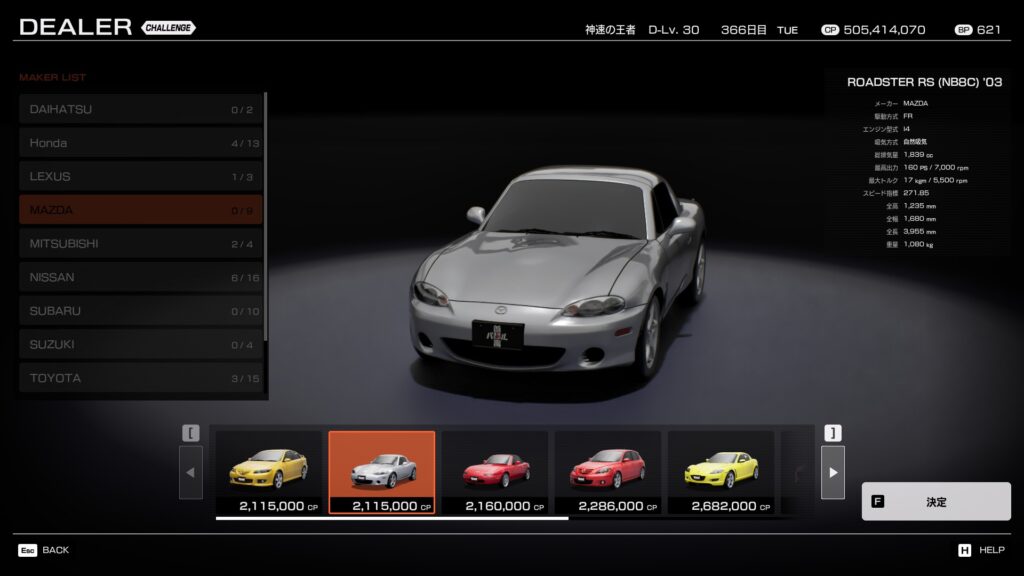 また、もう一つの象徴である「ロードスター」は、絶対的な速さよりも操る楽しさを重視したライトウェイトスポーツの代表格。軽快なハンドリングを武器に、テクニカルなコースでは格上のマシンを相手に互角以上の戦いを繰り広げることができるでしょう。